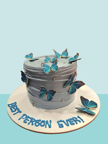 Graceful and eye-catching, this Elegant Butterfly Designer Cake is a perfect blend of beauty and taste. Finished in a smooth grey textured frosting, the cake features stunning blue butterfly toppers that create a delicate and artistic look.