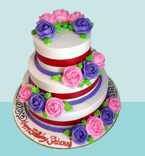 Presenting the vibrant and eye-catching Floral Ribbon Celebration Cake, a perfect blend of color, elegance, and festive charm. This beautifully designed three-tier cake features a smooth white cream base enhanced with bold red ribbon bands, creating a striking and modern look.