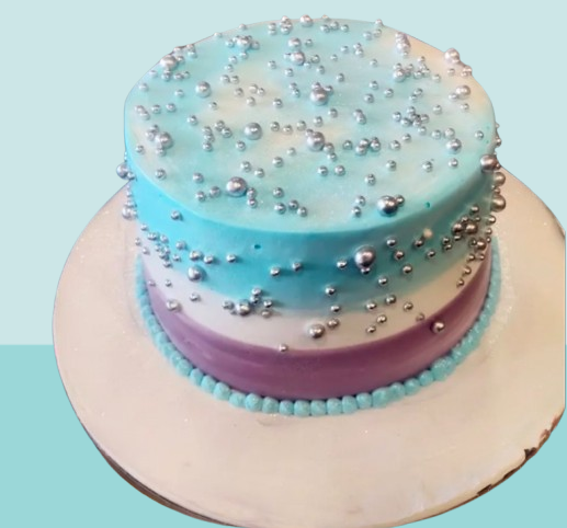 The highlight of this cake is the luxurious scattering of edible silver pearls across the top and sides, giving it a sparkling, celestial look. The smooth cream finish combined with delicate color transitions makes this cake a perfect choice for modern and sophisticated celebrations.
