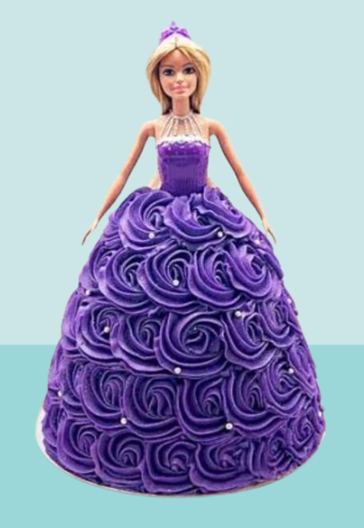 Make your celebration magical with this stunning Royal Purple Princess Doll Cake. Designed in an elegant doll shape, this cake features a graceful princess figure dressed in a luxurious gown made of rich purple cream rosettes.