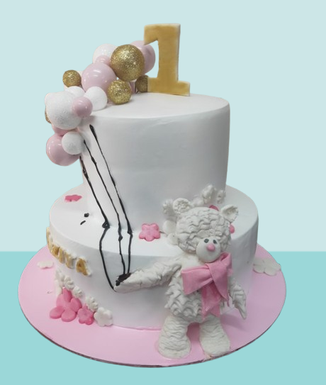The cake is beautifully decorated with a mix of pink, white, and golden elements, including playful balloon-style toppers and a bold number “1” to mark the special occasion. The handcrafted teddy bear with a bow brings a lovable and child-friendly touch, making it perfect for first birthday celebrations.