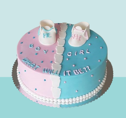 The message “Boy or Girl – What Will It Be?” is carefully crafted on the cake, making it a perfect centerpiece for baby showers and gender reveal parties. With its soft, creamy layers and delightful flavor, this cake ensures both visual appeal and delicious taste for your special occasion.